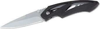 Features: Blade length: 3". Closed length: 4 1/4". Blade material: 420HC steel. Modified drop point, bead blasted blade. Handle material: Anodized black aluminum. Stainless steel pocket clip. Weight: 2.6 ounces.