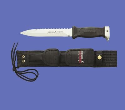 Features: Blade length: 7". Overall length: 12.25". Blade steel: Stainless steel. Handle: Thermoplastic rubber. Edge: Partially serrated. Sheath: Ballistic nylon. Handle color: Black. Blade color: Silver. Point: Spear point. Made in China.
