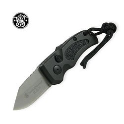 Smith & Wesson Knives - Matte Finish H.R.T. Button Lock Knife with Dark Gray Handles. Model: SW60. 3in. closed button lock with safety lock. Matte finish stainless blade. Dark gray finish aluminum handles with textured insert. Lanyard. Country of Origin: TAIWAN