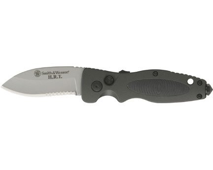 Smith & Wesson Knives - Matte Finish Part Serrated Medium H.R.T. Folder Buton Lock Knife with Metal Handles & Black Grips. Model: SW70S. 4 3/8in. closed button lock. Stainless matte finish partially serrated blade etched H.R.T. Black finish metal handle with black rubber inlays. Handle features integrated glass breaker tip. Lanyard hole. Black finish stainless pocket clip. Country of Origin: CHINA